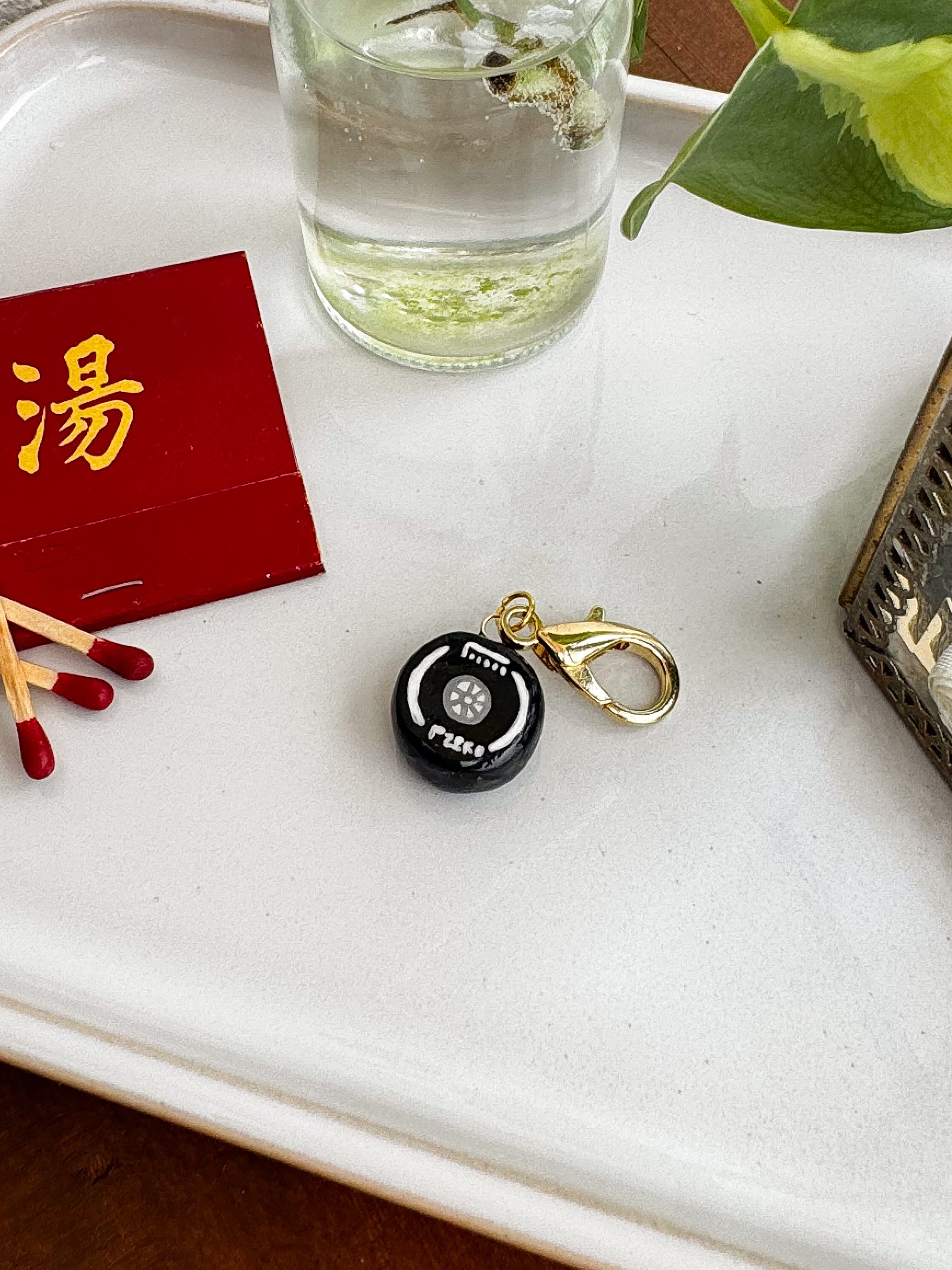 Handmade, hand painted polymer clay charm with lobster claw attachment. Water resistant and durable.