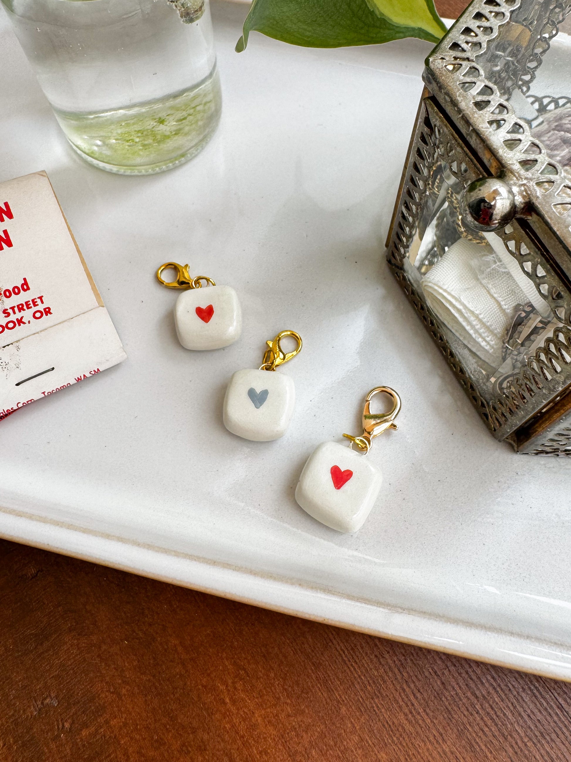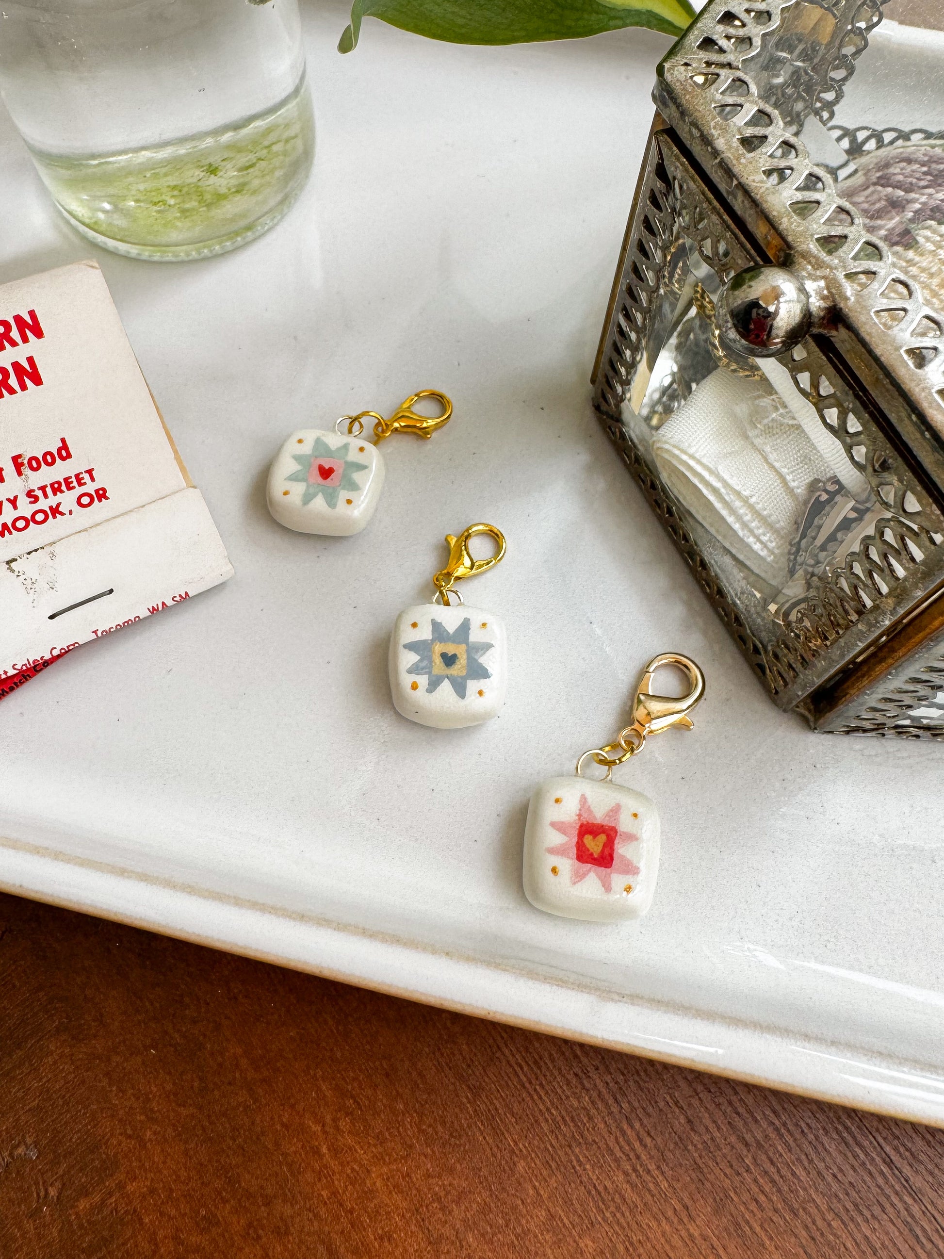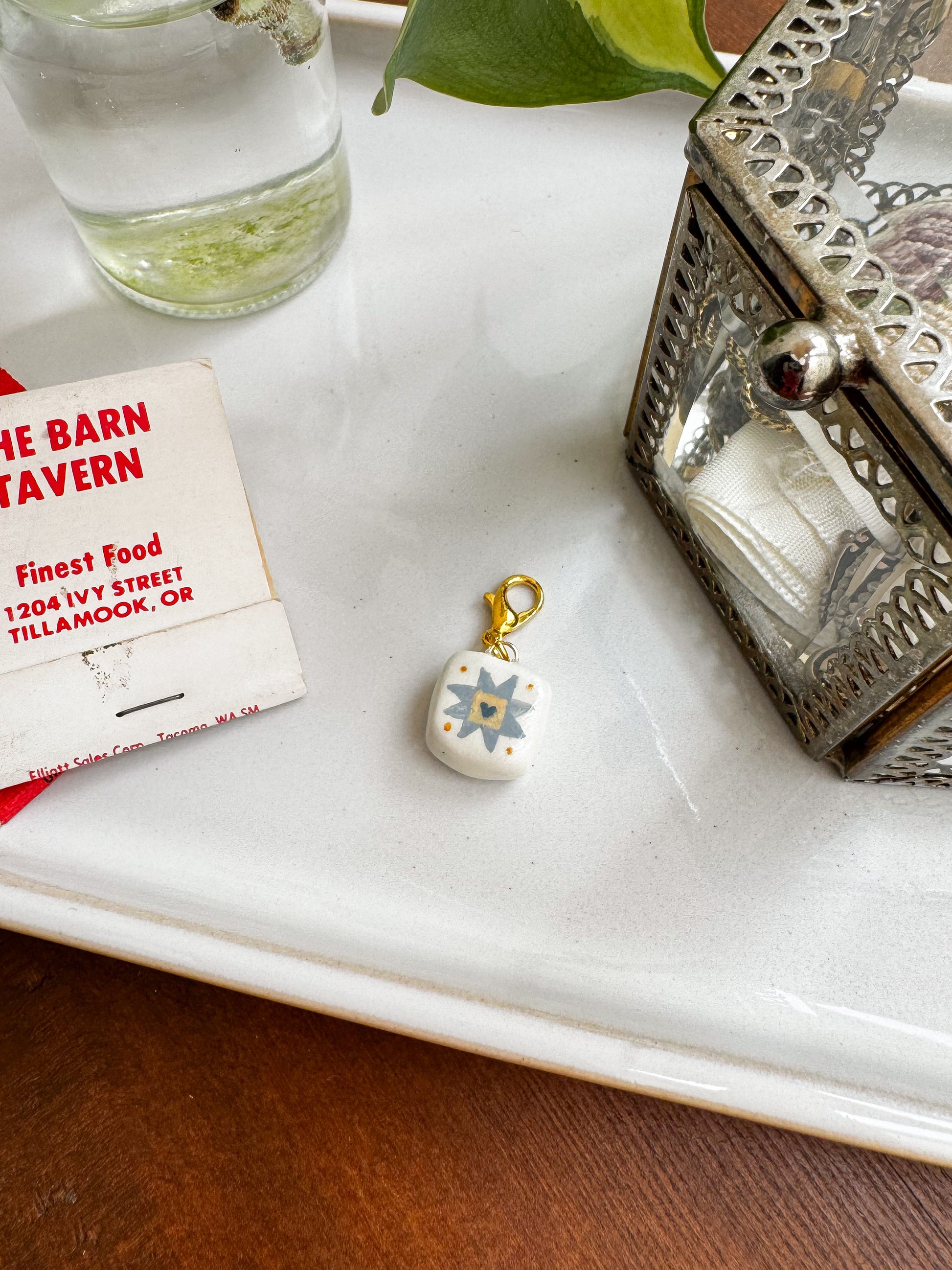 Handmade, hand painted polymer clay charm with lobster claw attachment. Water resistant and durable.