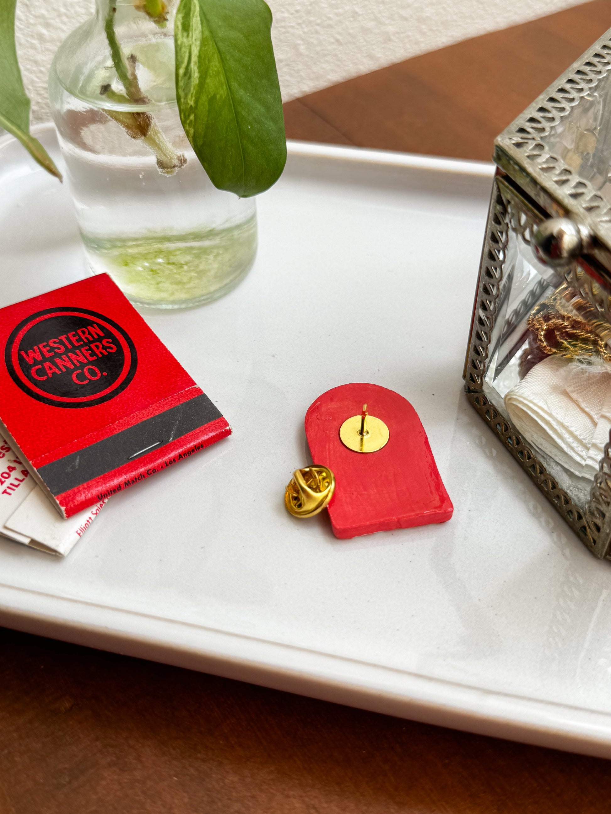 Handmade, hand painted polymer clay pin. Water resistant and durable.